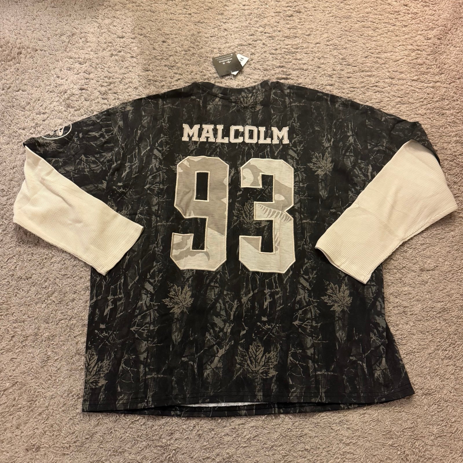 Venture into the jungle with this Jurassic Park top! Featuring embroidered "Jurassic Park" lettering, the front includes "93" patches with a T-Rex silhouette and "Malcolm 93" lettering on the back. With a camo print and layered long sleeves, this shirt is made for dino enthusiasts.