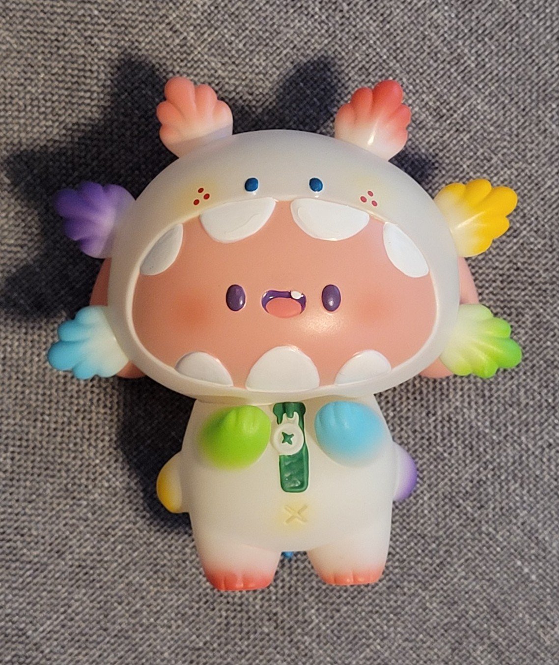 This adorable designer toy is a vinyl figure collaboration between Ngaew Ngaew and Grape Brain. The packaging is good, however there is a tiny bit of residue from the tape on it that I have pictured. The figure itself has been shelf kept and is wonderful condition. Comes with the 2 tiny resin figures in the last pic.
