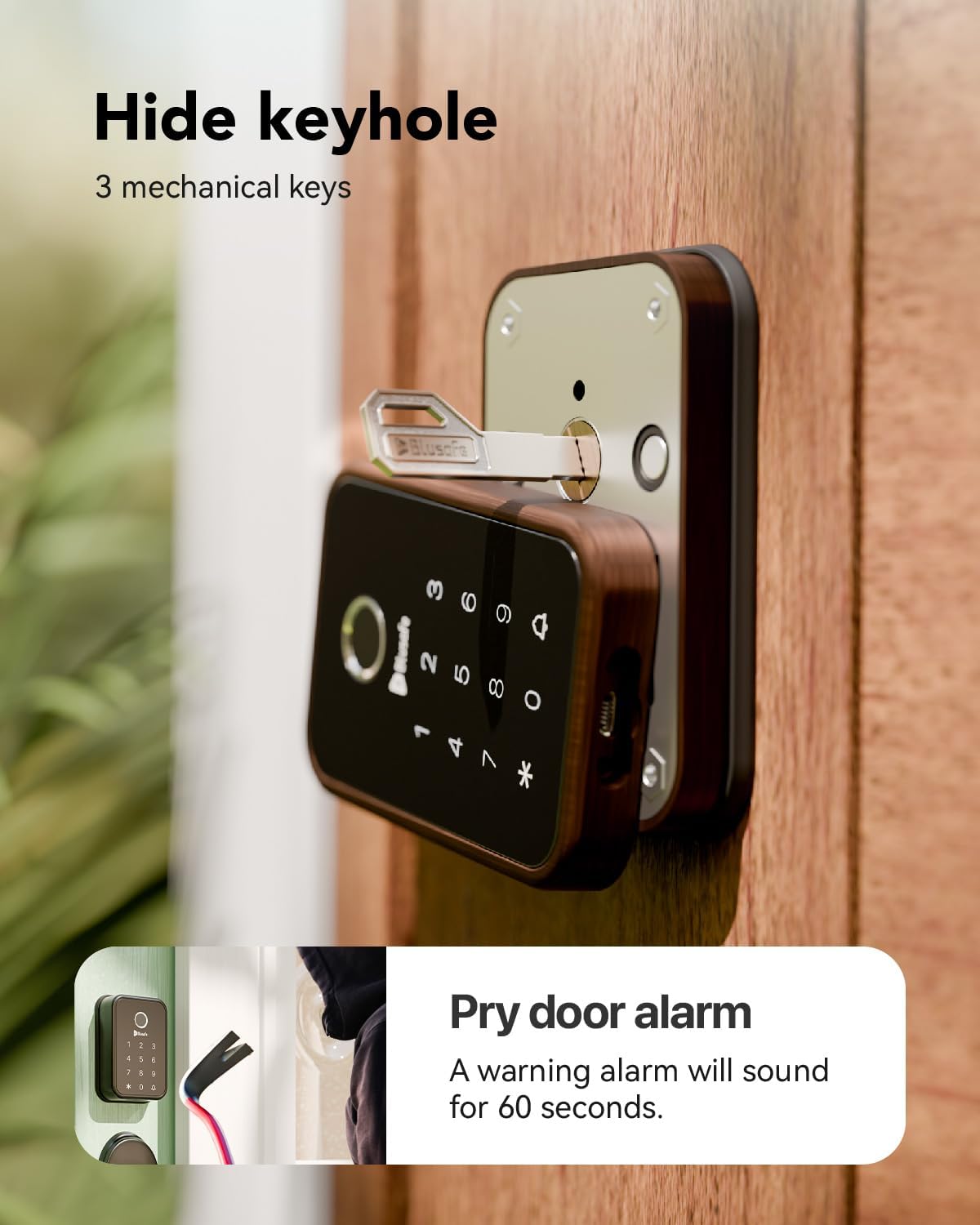 • 【Multifunctional Fingerprint Door Lock】 Unlock your fingerprint door lock with fingerprint, passcode, key card, or the Blusafe Smart App. Store up to 100 fingerprints and 50 passcodes, and share temporary electronic keys with guests, babysitters, or delivery personnel. A versatile fingerprint lock and smart door lock for homes, apartments, and offices.