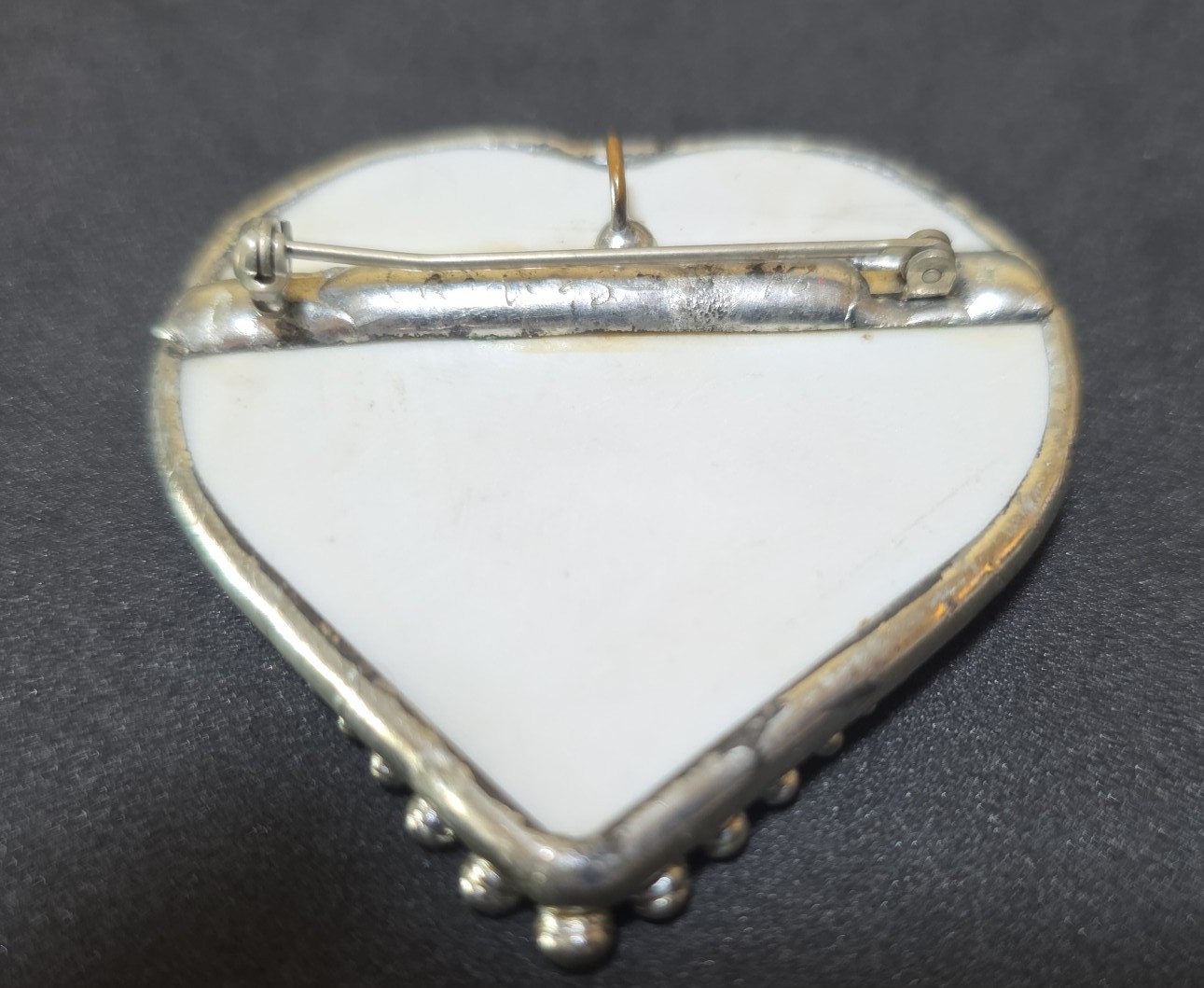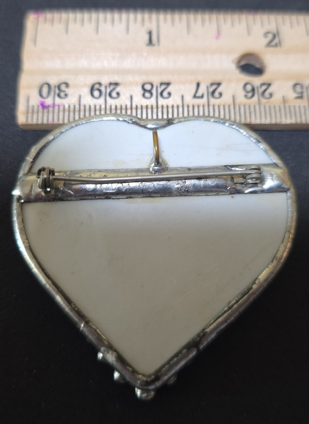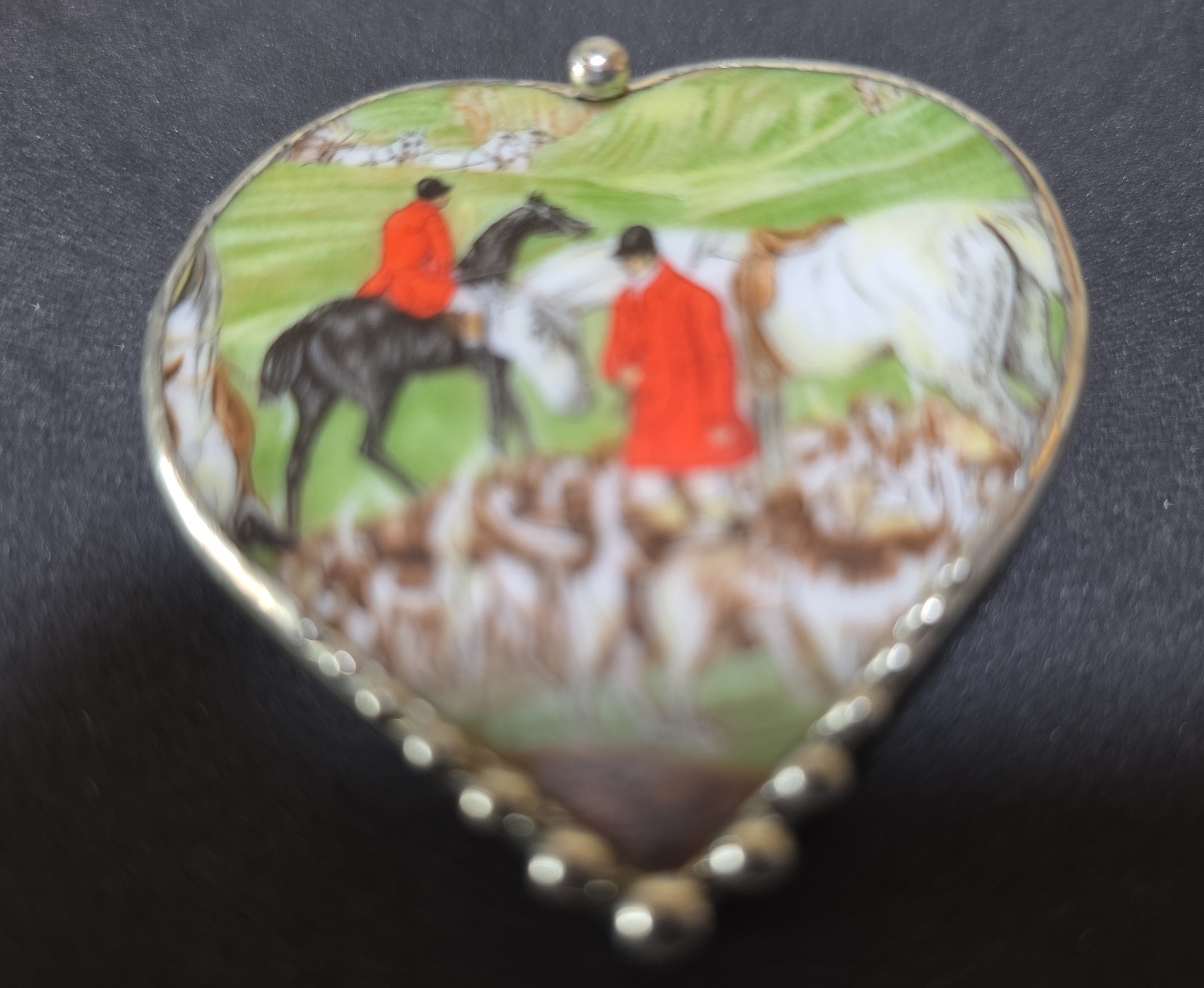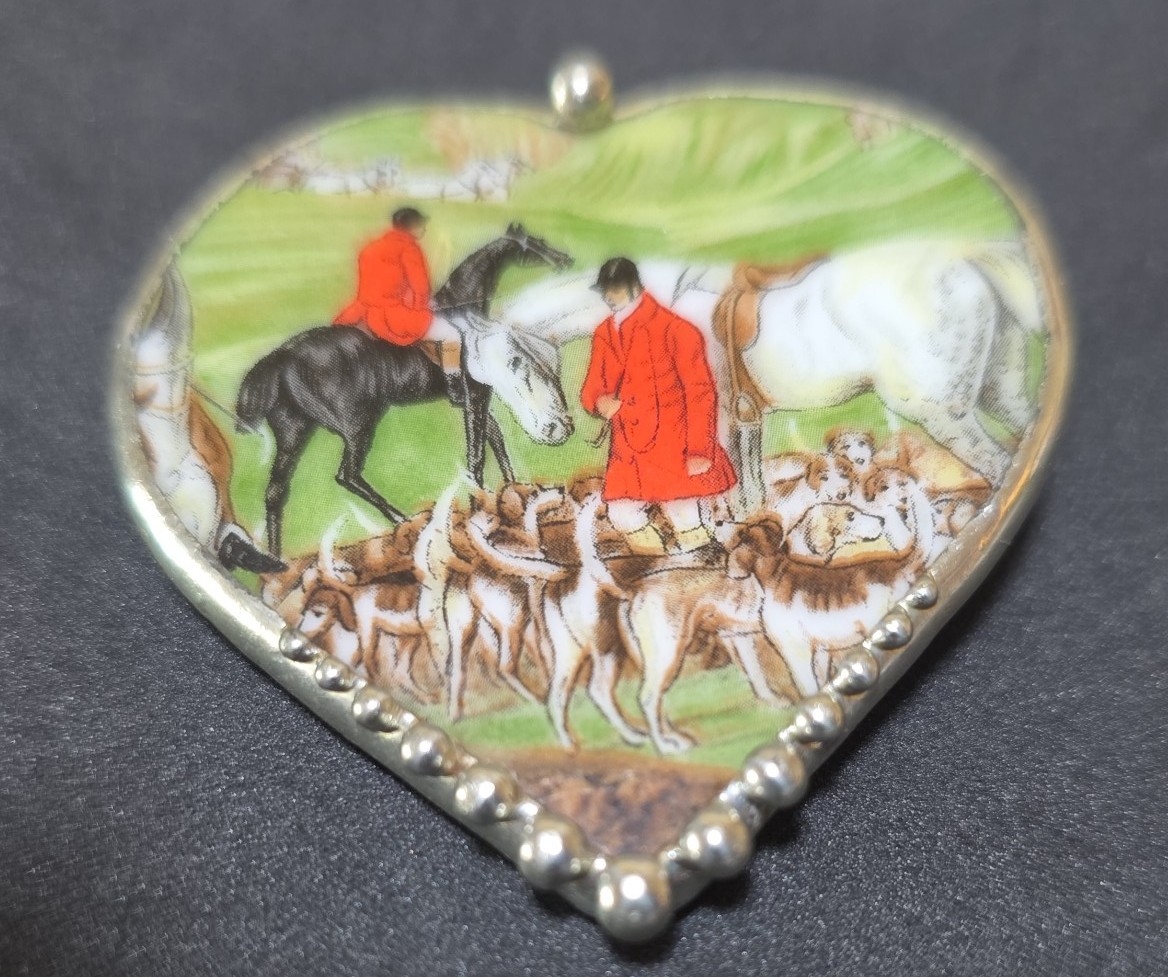 Unique vintage fox hunt scene with riders in traditional red jackets. Of course beautiful horses. Not hand painted even though I believe it handmade. Didn't test as silver. Bottom has beaded metal border. Slight bend in pin but works well. Signed like Carve....something and 98. Can also hang as a pendant . Chain not included.