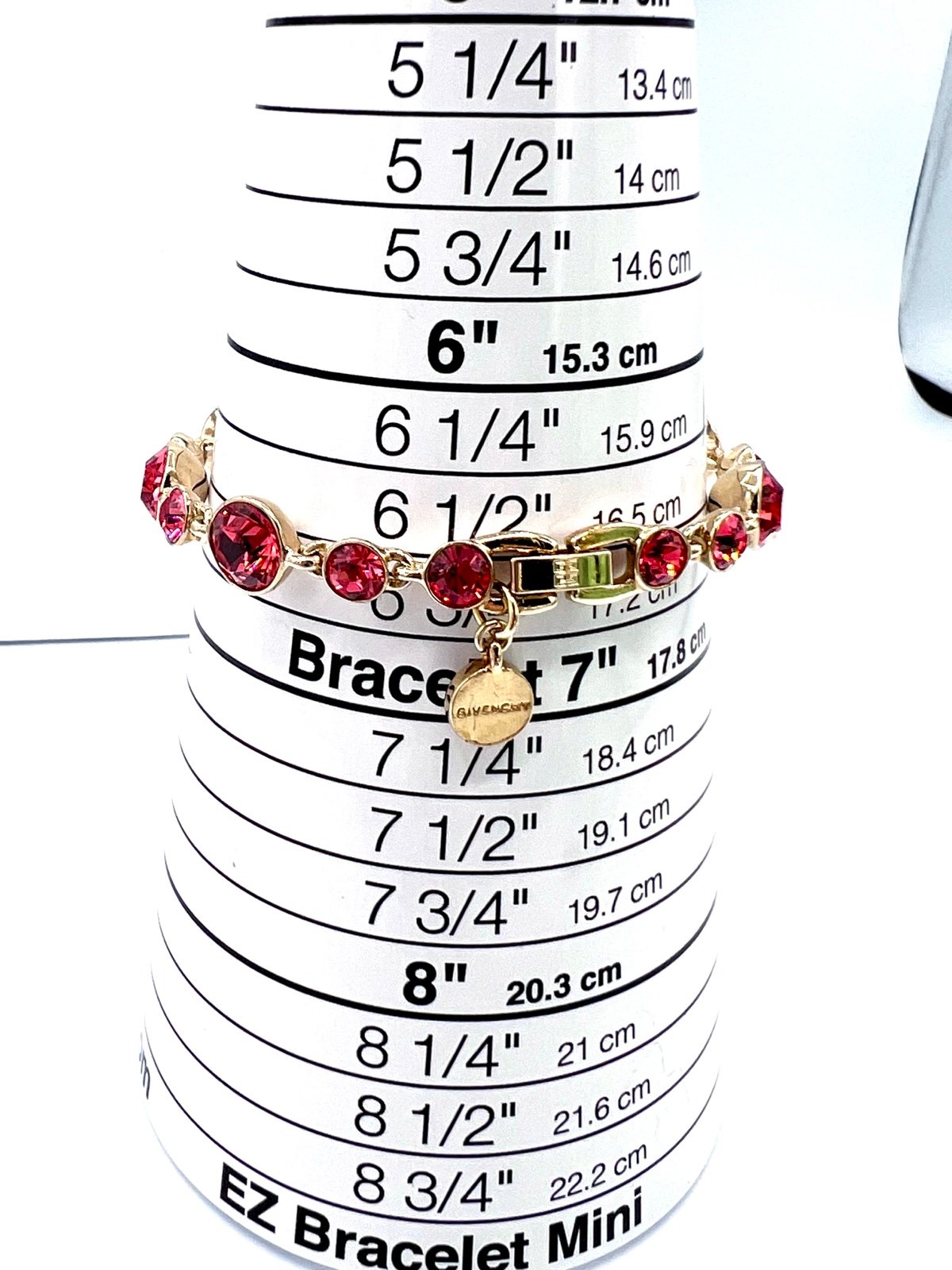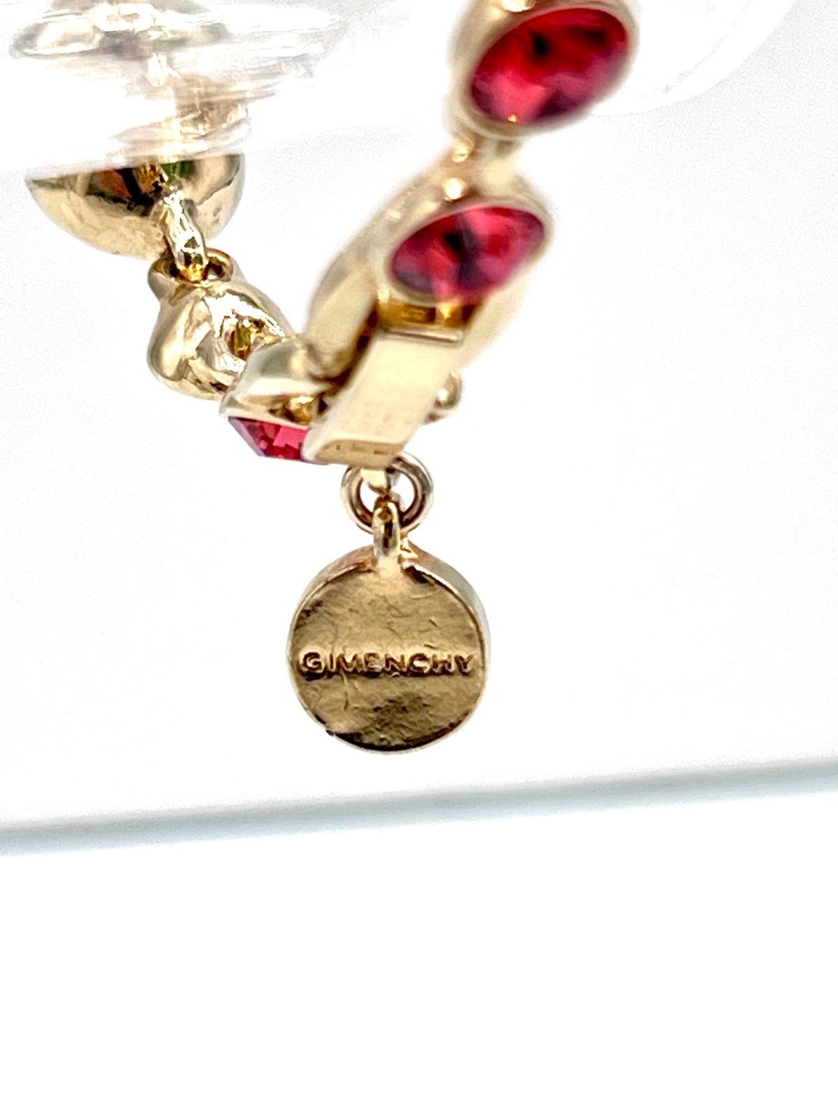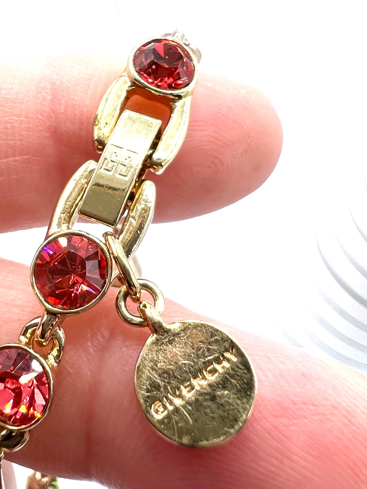 This stunning Givenchy bracelet radiates luxury and elegance. Crafted in gold tone metal, it features brilliant reddish-orange faceted crystals that capture the light beautifully. A round Givenchy logo charm adds the perfect designer touch, while the secure fold-over clasp ensures comfortable wear.